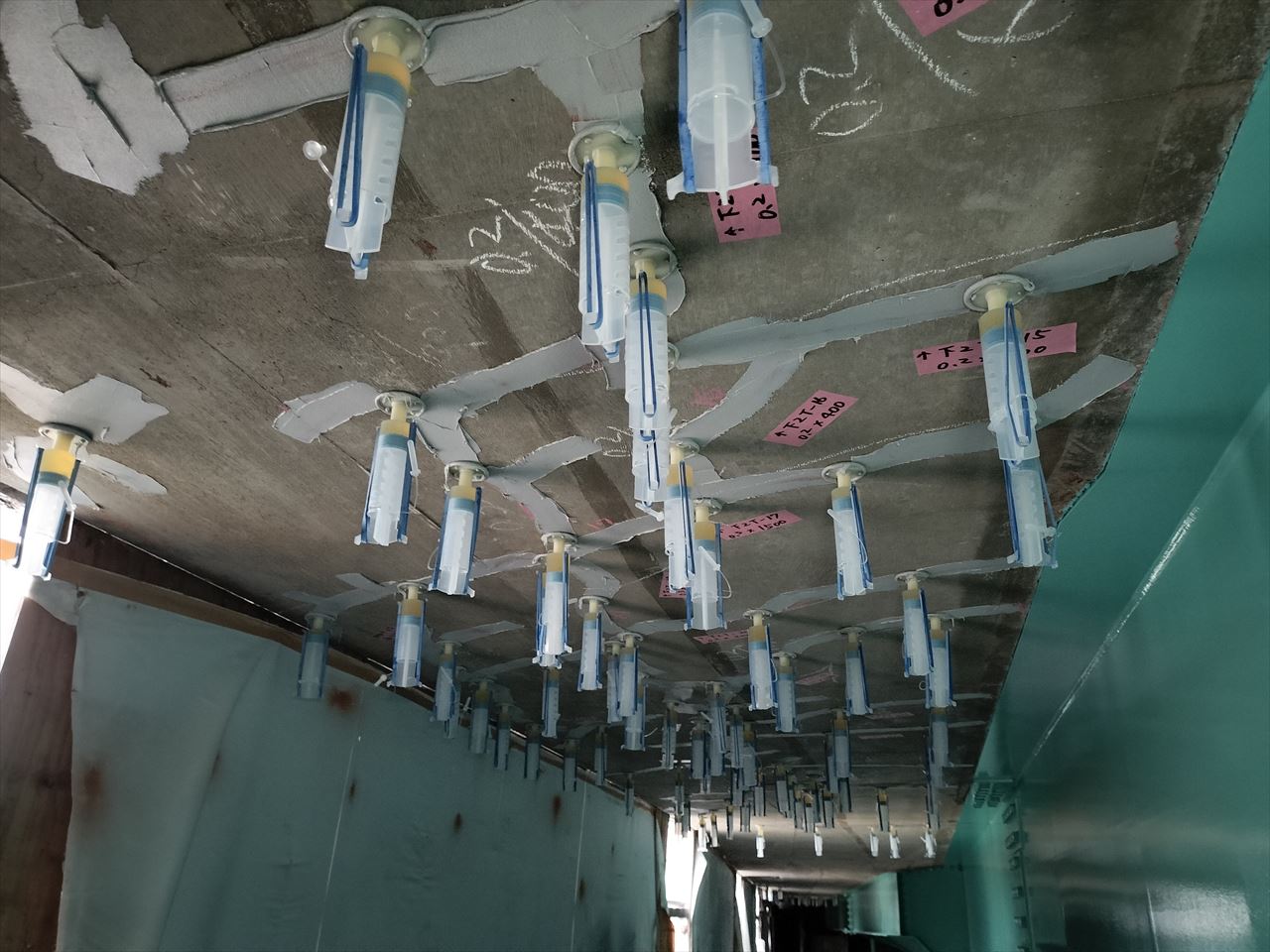 コンクリート構造物に生じたひび割れに樹脂などを注入し、劣化の原因となる酸素や水などの侵入を防ぎます。